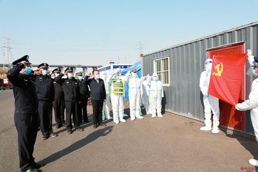 疫情防控一線工作人員在黨旗下宣誓