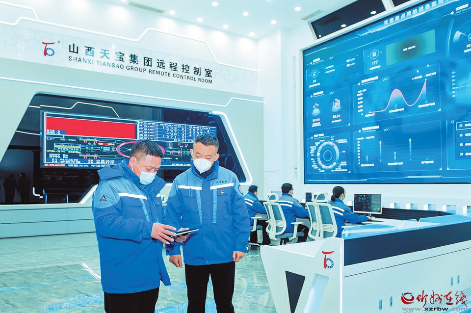 在遠(yuǎn)程控制室的山西天寶集團(tuán)有限公司黨支部書記、董事長胡大為正在通過大屏,實(shí)時(shí)查看訂單生產(chǎn)進(jìn)度,了解設(shè)備運(yùn)行狀況。