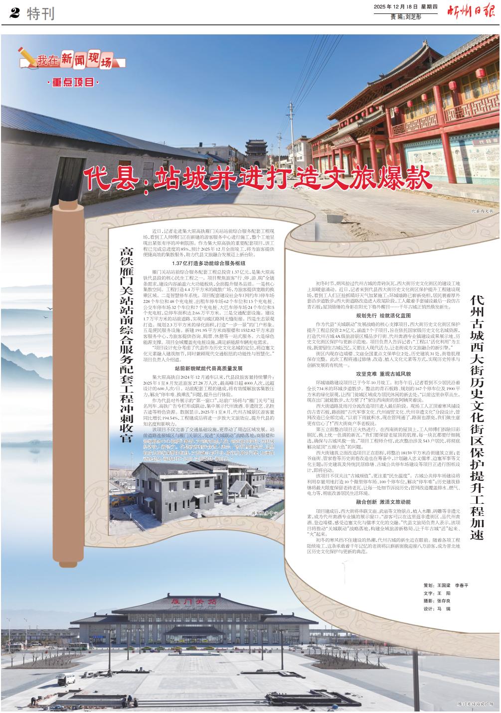 該項目不僅完善了交通基礎(chǔ)設(shè)施,更帶動了周邊區(qū)域發(fā)展。站前道路連接城區(qū)與雁門關(guān)景區(qū),促進“關(guān)城聯(lián)動”戰(zhàn)略落地;商服樓和游客服務中心將吸引餐飲、文創(chuàng)等業(yè)態(tài)入駐,創(chuàng)造就業(yè)崗位,為縣域經(jīng)濟注入新活力。代縣政府相關(guān)負責人表示:“該項目建成后,這里將成為旅客集散的樞紐、文旅融合的平臺、城市發(fā)展的引擎,加速推動我縣從‘高鐵時代’邁向‘文旅強縣’新時代。”