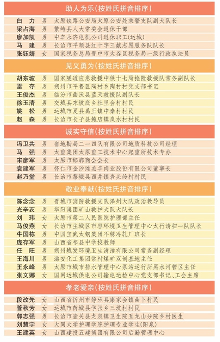 本次活動(dòng)評(píng)選出山西助人為樂好人、山西見義勇為好人、山西誠實(shí)守信好人、山西敬業(yè)奉獻(xiàn)好人、山西孝老愛親好人共31人。