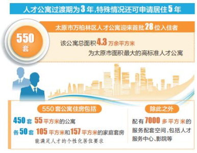太原市高度重視人才工作,大力實(shí)施人才強(qiáng)市戰(zhàn)略,不斷創(chuàng)新人才政策,優(yōu)化人才生態(tài),為各類人才提供廣闊的發(fā)展舞臺(tái)。作為太原市的核心城區(qū),萬(wàn)柏林區(qū)搶抓打造人才高地的重大機(jī)遇,精心建設(shè)拎包入住、設(shè)施齊全、服務(wù)優(yōu)質(zhì)的高品質(zhì)人才公寓。550套公寓住房包括450套55平方米的公寓、105平方米和157平方米的家庭套房各50套,能滿足人才的個(gè)性化居住要求。除此之外,還配有7000多平方米的服務(wù)配套空間,包括人才服務(wù)中心、影院、餐廳、書吧、健身房、創(chuàng)客空間等。