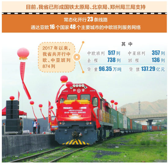 目前,我省已形成國鐵太原局、北京局、鄭州局三局支持,以晉中中鼎物流園、臨汾方略陸港、大同平旺、陽泉白羊墅、長治長鋼綠能物流園、太原皇后園、呂梁文水海威以及朔州、應(yīng)縣等啟運(yùn)站點(diǎn),經(jīng)滿洲里、二連浩特、阿拉山口、霍爾果斯、磨憨等5個(gè)口岸,常態(tài)化開行23條線路,通達(dá)亞歐16個(gè)國家48個(gè)主要城市的中歐班列服務(wù)網(wǎng)絡(luò)。