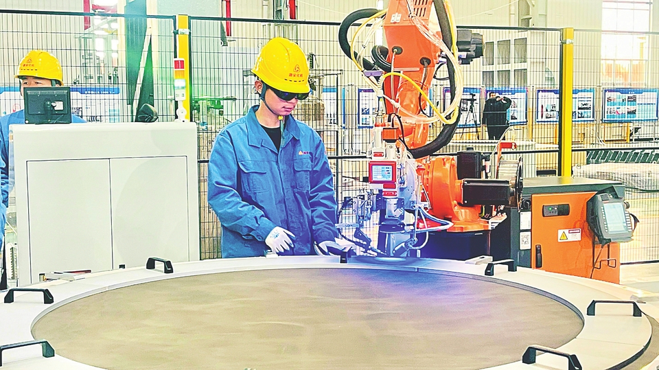 潞安化工機械(集團)有限公司新能源裝備分公司,工人正在操作一機雙工位鎳絲網(wǎng)激光焊接機。本報記者王蕾攝