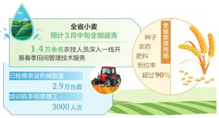 全省農(nóng)資市場備貨充足,價格穩(wěn)中有降。目前,種子、農(nóng)藥、肥料到位率超過90%。全省已檢修農(nóng)業(yè)機械數(shù)量2.9萬臺套,培訓(xùn)機手和修理工3000人次。