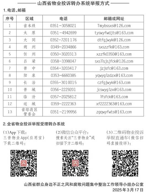 近日,省集中整治辦聚焦“整治物業(yè)服務(wù)不履約不到位、侵占業(yè)主利益等問題并建立完善物業(yè)企業(yè)退出機(jī)制”實(shí)事項目,推動省住建廳打造了“山西省智慧物業(yè)管理服務(wù)平臺暨全省物業(yè)投訴轉(zhuǎn)辦系統(tǒng)”,實(shí)現(xiàn)線上投訴、一鍵受理、銷號審核和督辦匯總等功能,省市縣三級一體化運(yùn)行,該系統(tǒng)已正式上線運(yùn)行。為廣泛聽取群眾意見,全面受理群眾投訴,接受群眾監(jiān)督,現(xiàn)將全省各地電話、郵箱、“三晉物業(yè)”二維碼等物業(yè)投訴舉報渠道向社會公布如圖。