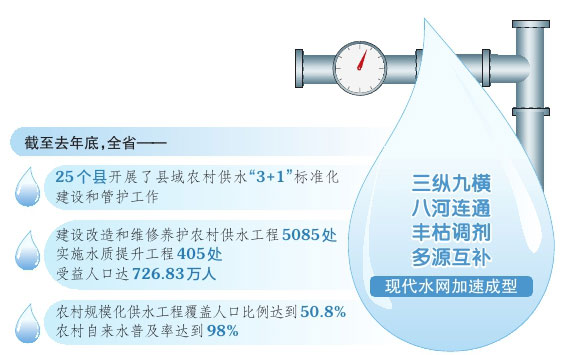 截至去年底,全省25個縣開展了縣域農(nóng)村供水“3+1”標(biāo)準(zhǔn)化建設(shè)和管護(hù)工作;建設(shè)改造和維修養(yǎng)護(hù)農(nóng)村供水工程5085處,實施水質(zhì)提升工程405處,受益人口達(dá)726.83萬人;農(nóng)村規(guī)?;┧こ谈采w人口比例達(dá)到50.8%,農(nóng)村自來水普及率達(dá)到98%。
