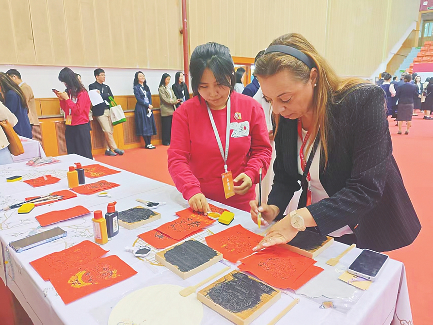 外國(guó)友人正在體驗(yàn)?zāi)景婺戤?。本?bào)記者張劍雯攝