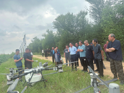 8月18日下午,在朔城區(qū)高升農(nóng)機專業(yè)合作社的試驗田里,一場別開生面的“病蟲害綠色防控田間課堂”正在進行——沒有黑板粉筆,取而代之的是嗡嗡作響的無人機、閃著藍光的太陽能殺蟲燈,還有掛在玉米稈上不起眼的小卡片……來自全區(qū)各鄉(xiāng)鎮(zhèn)的種糧大戶代表、農(nóng)機合作社負責人、農(nóng)技人員共計50余人一起觀摩學習。