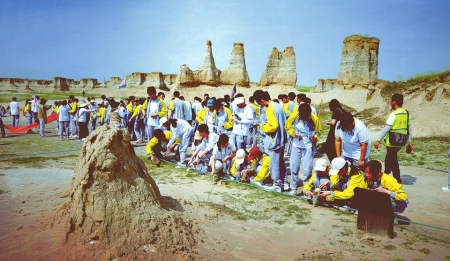 前來研學的學生們近距離觀察地貌。資料圖片
