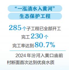 與此同時,我省牢記習(xí)近平總書記寄予山西“一泓清水入黃河”的殷切期盼,2023年6月,啟動了“一泓清水入黃河”生態(tài)保護(hù)工程,計劃用三年時間,對黃河的第二大支流——汾河,進(jìn)行全流域、全方位治理?!耙汇逅朦S河”生態(tài)保護(hù)工程在聚焦水質(zhì)改善目標(biāo)的基礎(chǔ)上,銜接水網(wǎng)建設(shè)、防洪能力提升、黑臭水體治理等多種類型,通過上下游、干支流、左右岸、水陸域一體謀劃,治污、調(diào)水、清淤、增濕、綠岸一體實施,取得了初步的生態(tài)效益、社會效益、經(jīng)濟(jì)效益。如今,285個子工程已完工230個、完工率達(dá)到80.7%。