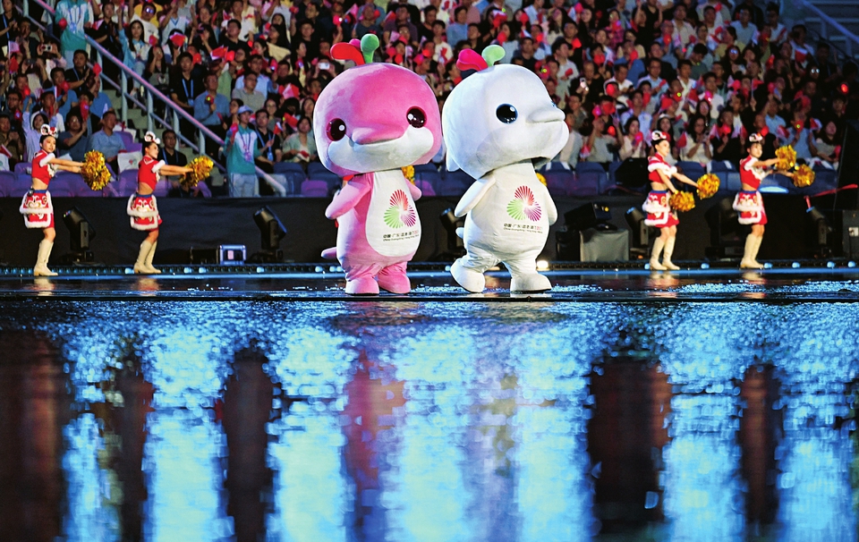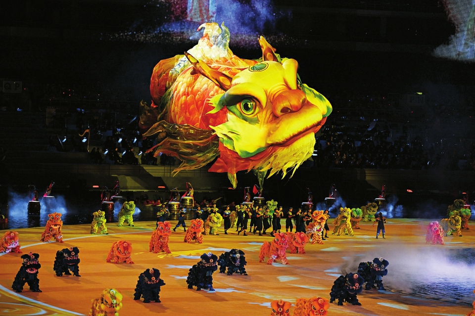 第十五屆全國運(yùn)動會吉祥物“喜洋洋”和“樂融融”在開幕式現(xiàn)場表演。圖片均為開幕式表演現(xiàn)場。 本版圖片均來源新華社