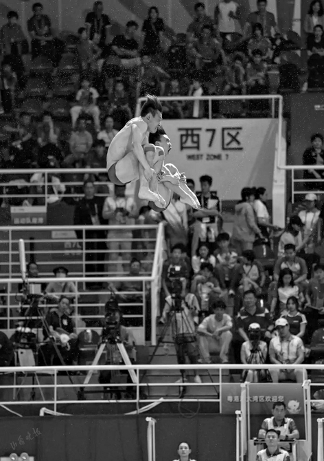 山西選手李政、梁朝輝在跳水項(xiàng)目男子雙人3米跳板比賽中。
