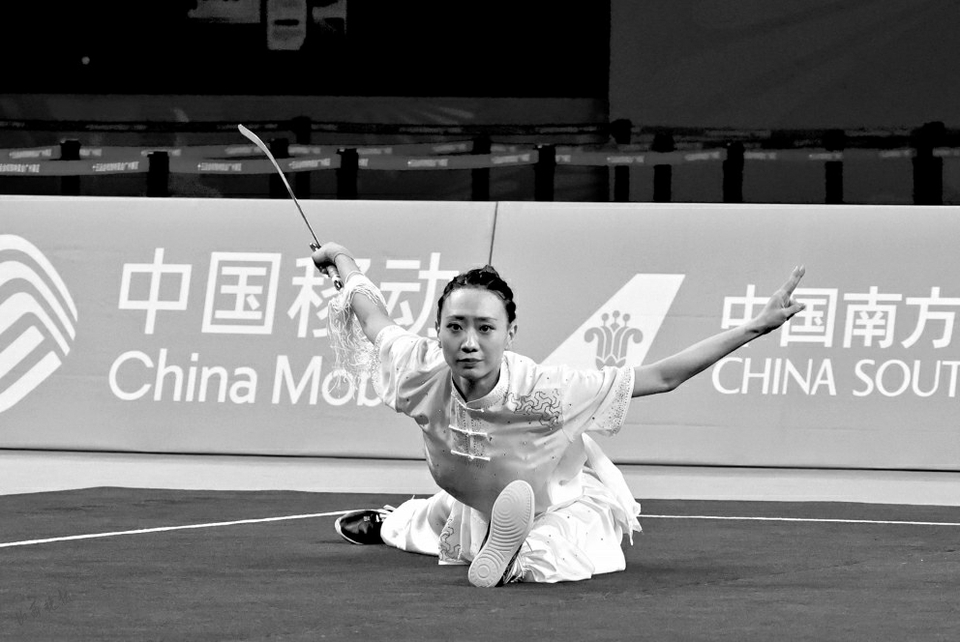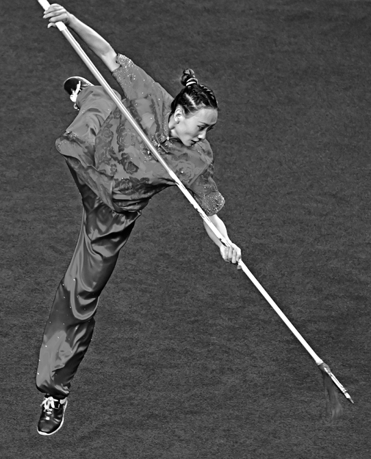 山西隊(duì)選手姚洋在武術(shù)套路女子長拳劍術(shù)槍術(shù)全能比賽中。