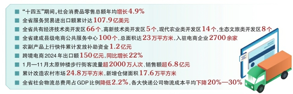 數(shù)字顯示,“十四五”期間,社會消費品零售總額年均增長4.9%,建成100個鄉(xiāng)村e鎮(zhèn),打造了大同黃花等113個區(qū)域公用品牌。農(nóng)產(chǎn)品上行快件補(bǔ)助帶動約33億元農(nóng)產(chǎn)品銷售。實物商品網(wǎng)上零售額年均增長24.1%,高于全國17.1個百分點。