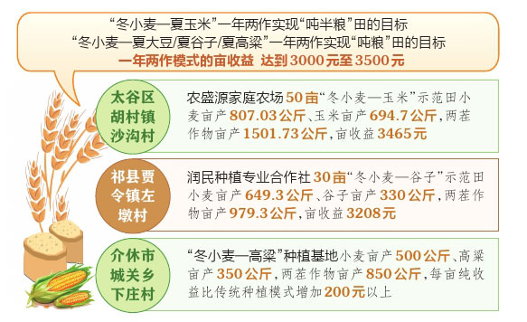 令人欣喜的是,實踐給出了響亮而積極的回答。我省“冬小麥—夏玉米”一年兩作實現(xiàn)“噸半糧”田的目標,“冬小麥—夏大豆/夏谷子/夏高粱”一年兩作實現(xiàn)“噸糧”田的目標,一年兩作模式的畝收益達到3000元至3500元。太谷區(qū)胡村鎮(zhèn)沙溝村農(nóng)盛源家庭農(nóng)場50畝“冬小麥—玉米”示范田小麥畝產(chǎn)807.03公斤、玉米畝產(chǎn)694.7公斤,兩茬作物畝產(chǎn)1501.73公斤,畝收益3465元。祁縣賈令鎮(zhèn)左墩村潤民種植專業(yè)合作社30畝“冬小麥—谷子”示范田小麥畝產(chǎn)649.3公斤、谷子畝產(chǎn)330公斤,兩茬作物畝產(chǎn)979.3公斤,畝收益3208元。介休市城關鄉(xiāng)下莊村“冬小麥—高粱”種植基地小麥畝產(chǎn)500公斤、高粱畝產(chǎn)350公斤,兩茬作物畝產(chǎn)850公斤,每畝純收益比傳統(tǒng)種植模式增加200元以上。
