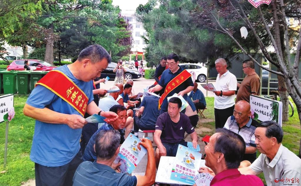 黨群服務站工作人員向社區(qū)居民發(fā)放防范非法集資宣傳資料