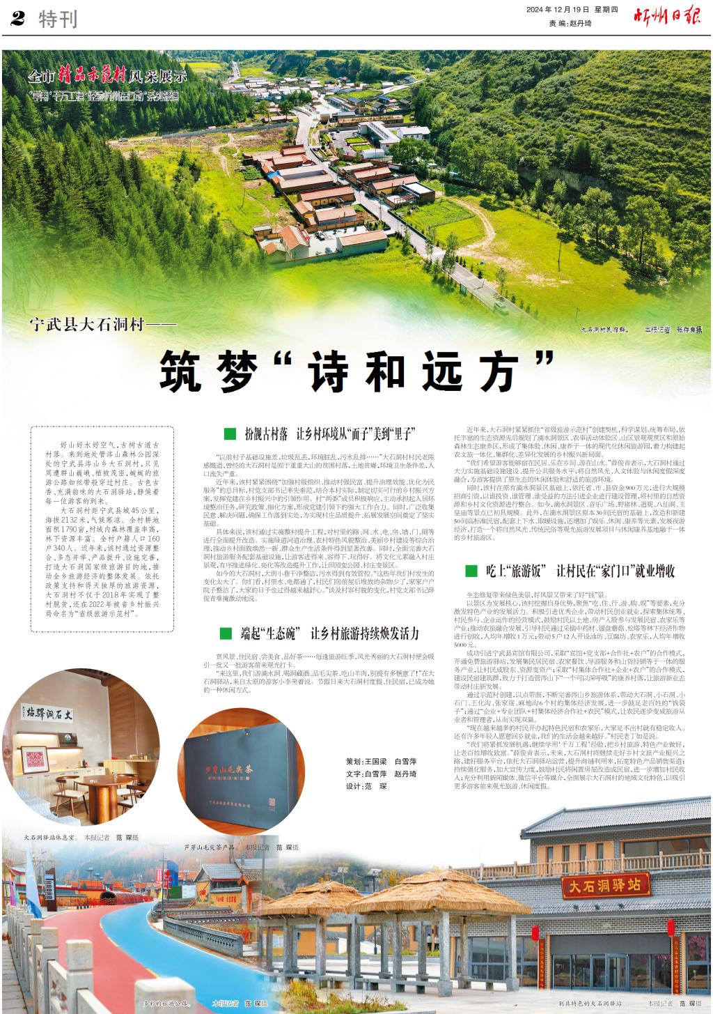 “我們將緊抓發(fā)展機(jī)遇,繼續(xù)學(xué)用‘千萬(wàn)工程’經(jīng)驗(yàn),把鄉(xiāng)村旅游、特色產(chǎn)業(yè)做好,讓老百姓增收致富。”薛俊青表示,未來(lái),大石洞村將繼續(xù)走好鄉(xiāng)村文旅產(chǎn)業(yè)振興之路,建好服務(wù)平臺(tái),依托大石洞驛站運(yùn)營(yíng),提升商鋪利用率,拓寬特色產(chǎn)品銷(xiāo)售渠道;持續(xù)強(qiáng)化服務(wù),加大宣傳力度,鼓勵(lì)村民將閑置房屋改造成民宿,進(jìn)一步增加村民收入;充分利用新聞媒體、微信平臺(tái)等媒介,全面展示大石洞村的地域文化特色,以吸引更多游客前來(lái)觀(guān)光旅游、休閑度假。