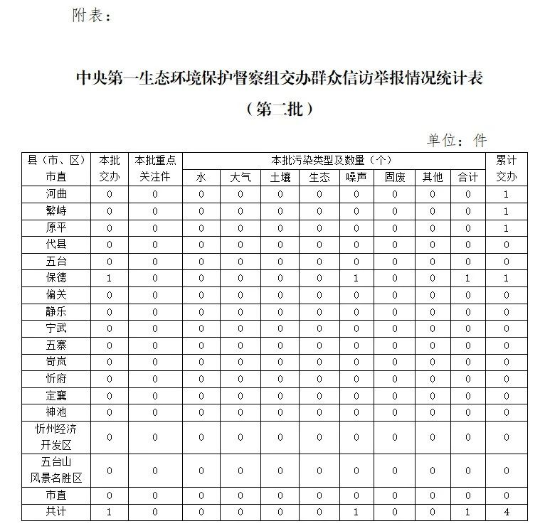 2025年5月30日,中央第一生態(tài)環(huán)境保護督察組向我市交辦的第二批信訪舉報件,共1件,其中重點件0件。 按區(qū)域和部門劃分,保德縣1件。本批轉(zhuǎn)辦的信訪件,涉及生態(tài)環(huán)境問題1個,其中,噪聲問題1個。 當(dāng)日,上述信訪舉報件均已轉(zhuǎn)交相關(guān)縣。 截至5月30日,中央第一生態(tài)環(huán)境保護督察組累計向我市交辦信訪件4件,其中重點關(guān)注件0件。交辦的信訪件中,涉及原平市1件、河曲縣1件、繁峙縣1件、保德縣1件;涉及生態(tài)環(huán)境問題4個,其中水污染問題1個、大氣污染問題1個、生態(tài)破壞問題1個、噪聲污染問題1個。 注:具體情況見附表