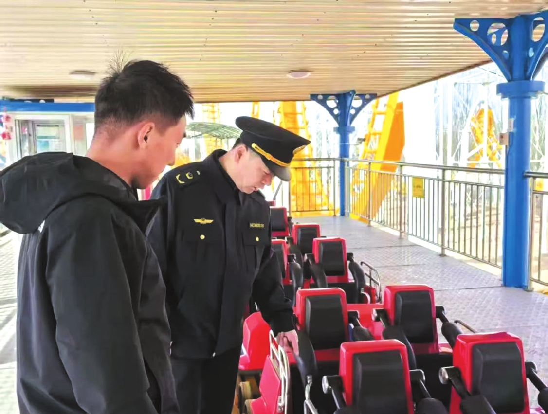 圖為執(zhí)法人員深入一線,檢查游樂設施安全狀況。