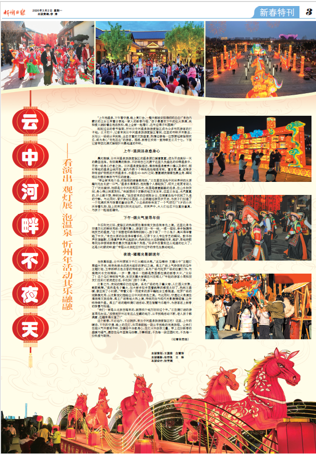 “上午泡溫泉,下午看非遺,晚上賞燈會,一整天都被安排得明明白白!”來自內蒙古的王女士笑著分享她一家人的新春行程,“孩子最喜歡下午的社火表演,我和愛人就盼著去泡湯放松,晚上全家一起看燈,這年過得才叫圓滿!”