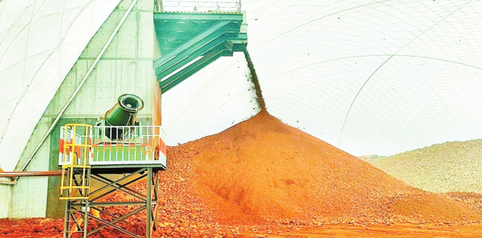 4月15日,4號(hào)氣膜倉內(nèi)正在進(jìn)行自動(dòng)化礦石倒運(yùn)作業(yè),同步開啟霧炮機(jī)降塵。 高舒軍攝