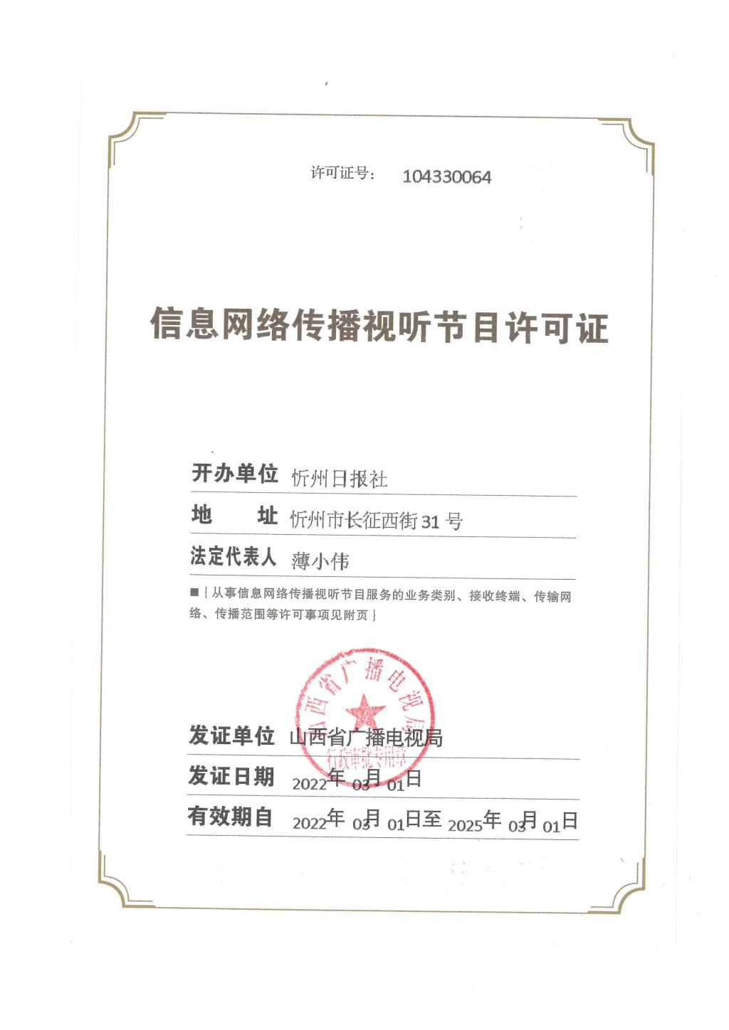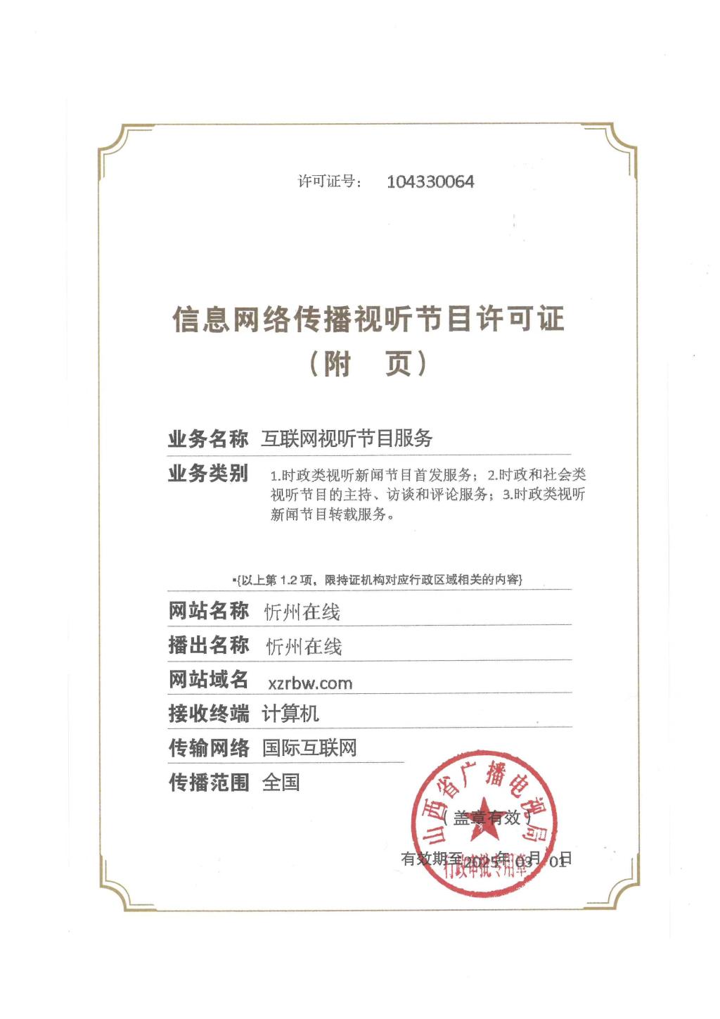忻州在線信息網(wǎng)絡(luò)傳播視聽(tīng)節(jié)目許可證