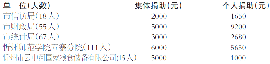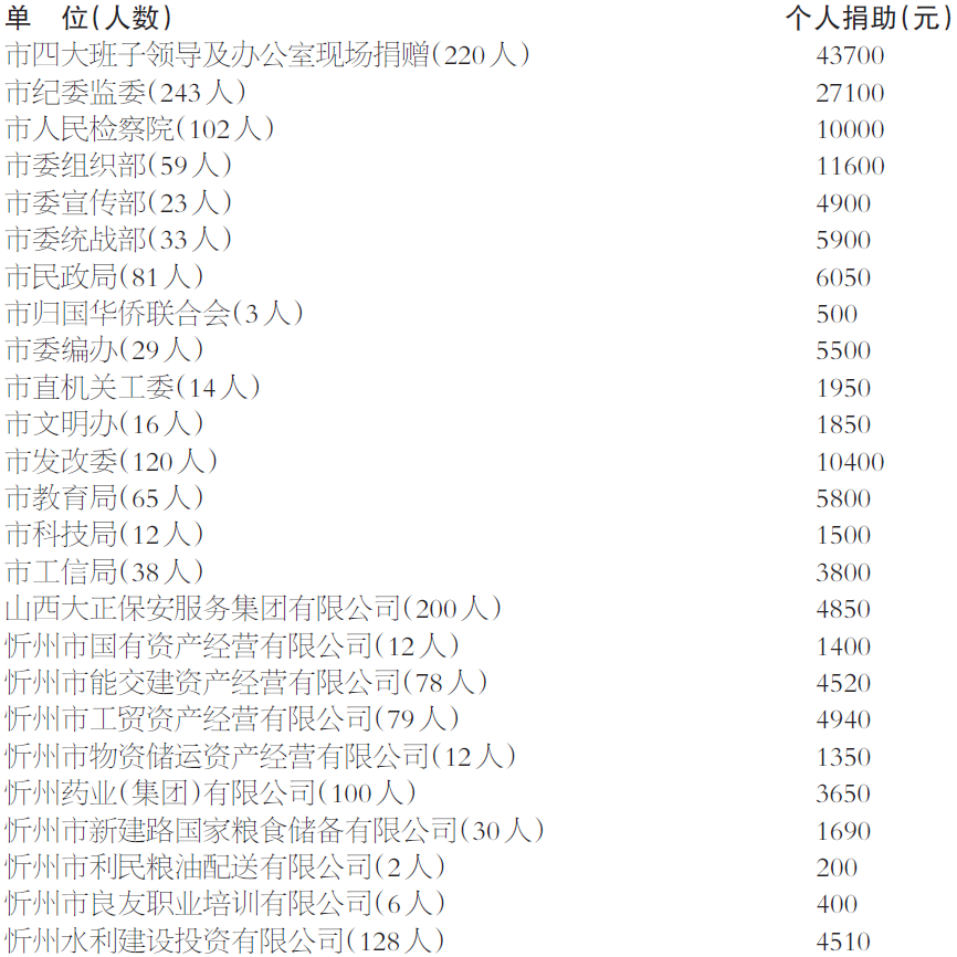 2023年11月10日,市委、市政府辦公室發(fā)出《關(guān)于開展“送溫暖、獻愛心”社會捐助活動的通知》,市四大班子領(lǐng)導(dǎo)和機關(guān)率先垂范,各縣(市、區(qū))、各單位高度重視,認真組織,廣大干部職工積極響應(yīng),“送溫暖、獻愛心”社會捐助活動有效開展。截至2024年4月底,市直133個單位組織干部職工參與捐助,共捐款83.37萬元,各縣(市、區(qū))接收捐款365.92萬元,合計捐款449.29萬元,為解決我市困難群眾的基本生活問題起到了積極作用。現(xiàn)將捐助情況公告如下(市直單位以捐助時間先后為序):