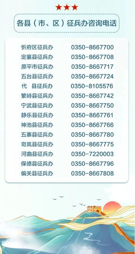 各縣(市、區(qū))征兵辦公室咨詢電話,請關(guān)注并進(jìn)入微信公眾號“山西征兵”點(diǎn)擊下方“聯(lián)系我們”中“各地征兵辦電話”查詢。