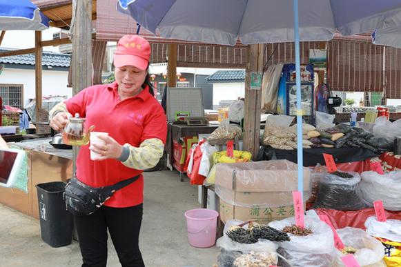 “天太熱,來喝口我這免費(fèi)的茶。”才入連樟村村口,記者便被熱情的村民陸秀媚招呼到了自己的攤位。紅茶、本地枝葉、山柑皮、筍干……她的攤位琳瑯滿目,擺得滿滿當(dāng)當(dāng)。陸秀媚告訴記者,自己曾經(jīng)在市里賣童裝,剛開始還能掙到些錢,后來隨著網(wǎng)購興起,實體店的生意越來越難做。2018年,在習(xí)近平總書記來連樟村視察后,看到家鄉(xiāng)越變越好,陸秀媚選擇了回到村里創(chuàng)業(yè)。