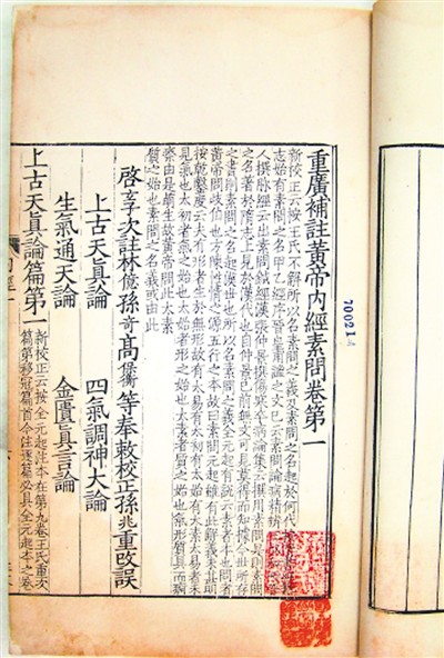 明嘉靖二十九年重廣補注黃帝內經(jīng)素問二十四卷,甘肅省圖書館藏?!饵S帝內經(jīng)》提出對瘟疫要早發(fā)現(xiàn)早治療,治療后防止復發(fā)。