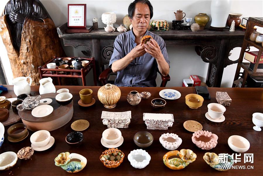 在河南省鞏義市站街鎮(zhèn)小黃冶村的工作室里,游光明在查看他燒制的“三彩雕花杯”(6月19日攝)。新華社記者 李安 攝