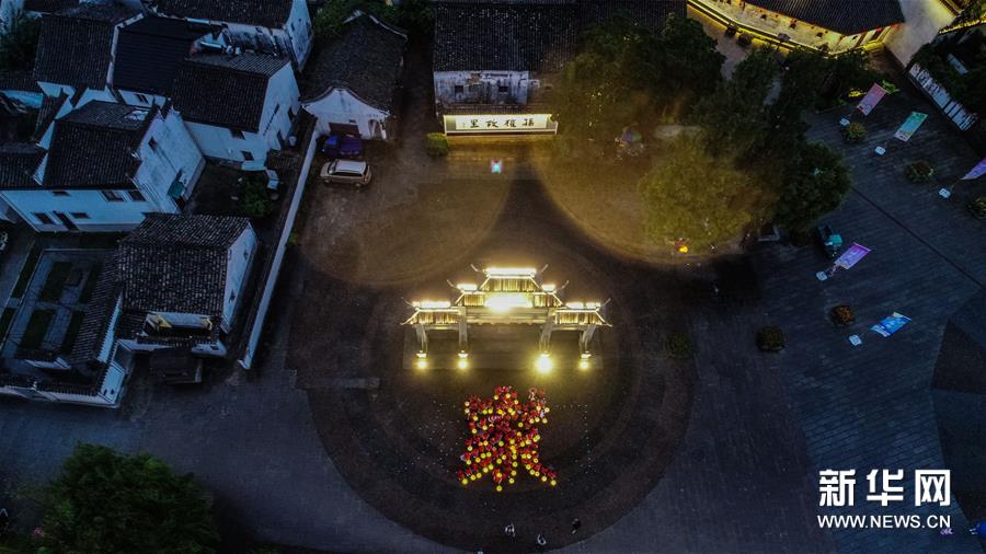 9月29日,龍門鎮(zhèn)文明志愿幫幫團(tuán)的志愿者提著花燈排成一個“家”字,慶祝古鎮(zhèn)廟會開啟(無人機(jī)照片)。新華社記者 徐昱 攝