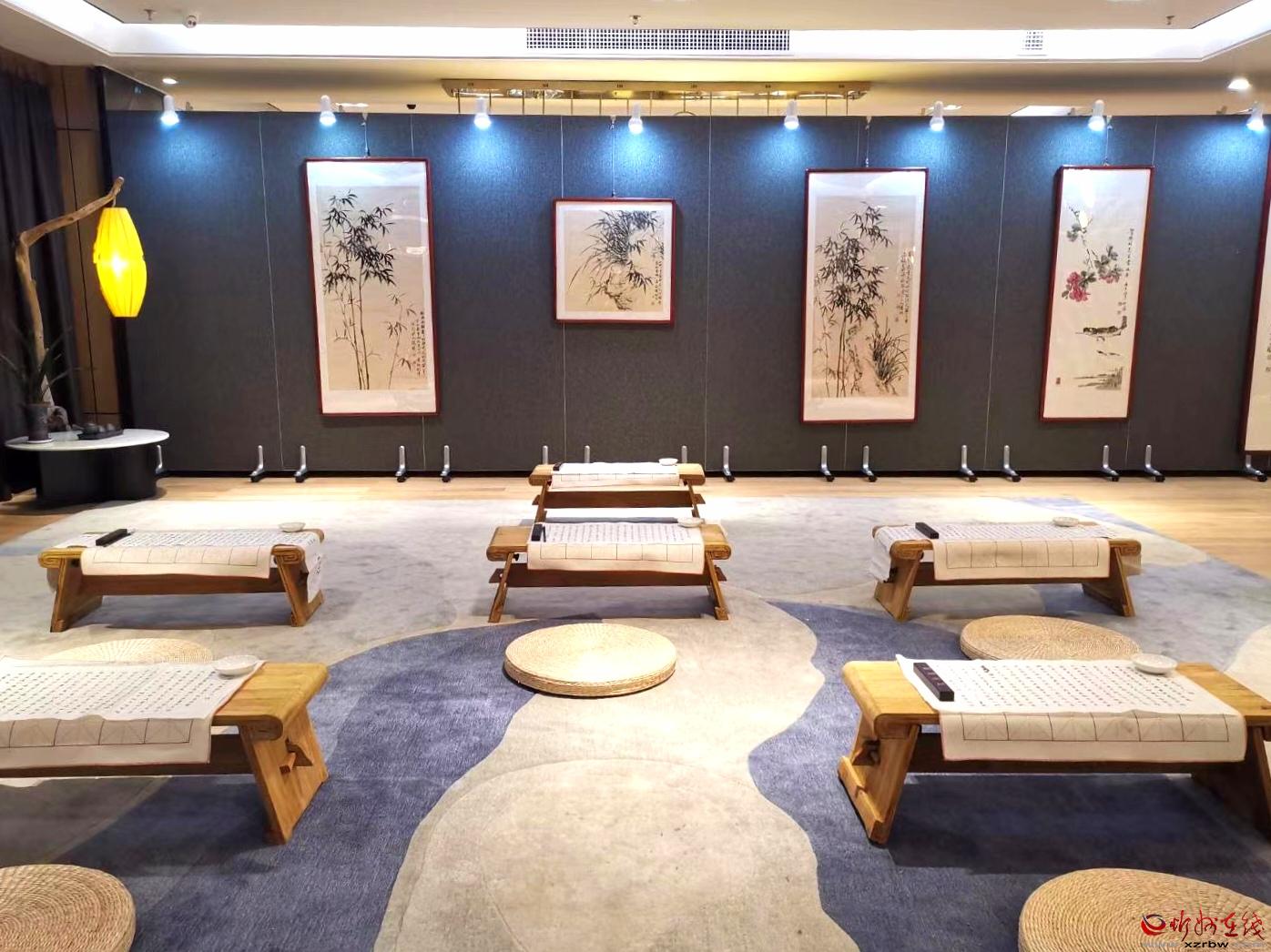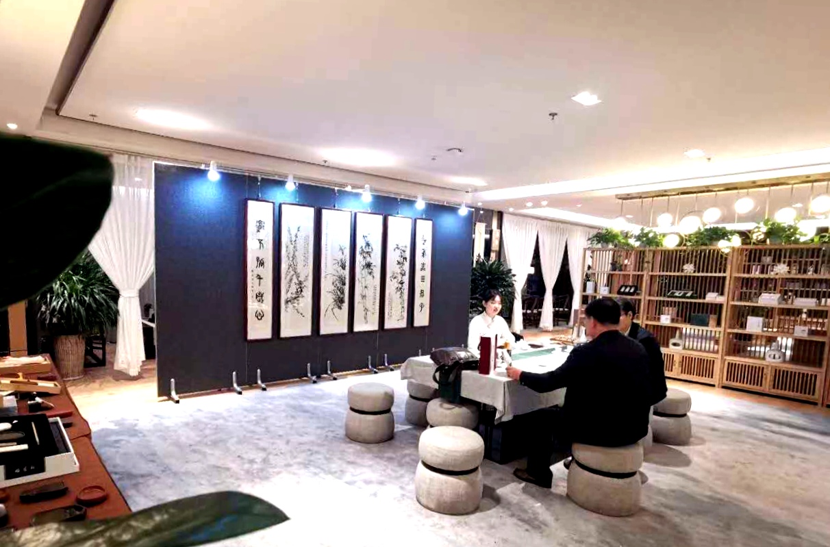 繞過木架綠植,穿行于鋪陳有字貼宣紙的書案,現(xiàn)場彈奏的琵琶古韻從耳畔飄過,茶香伴著墨香沁人心脾。你可以駐足細品這些書畫的精微高超之處,你可以圍桌而坐品茗閑談,興起時你還可以搖管潑墨揮灑一番……