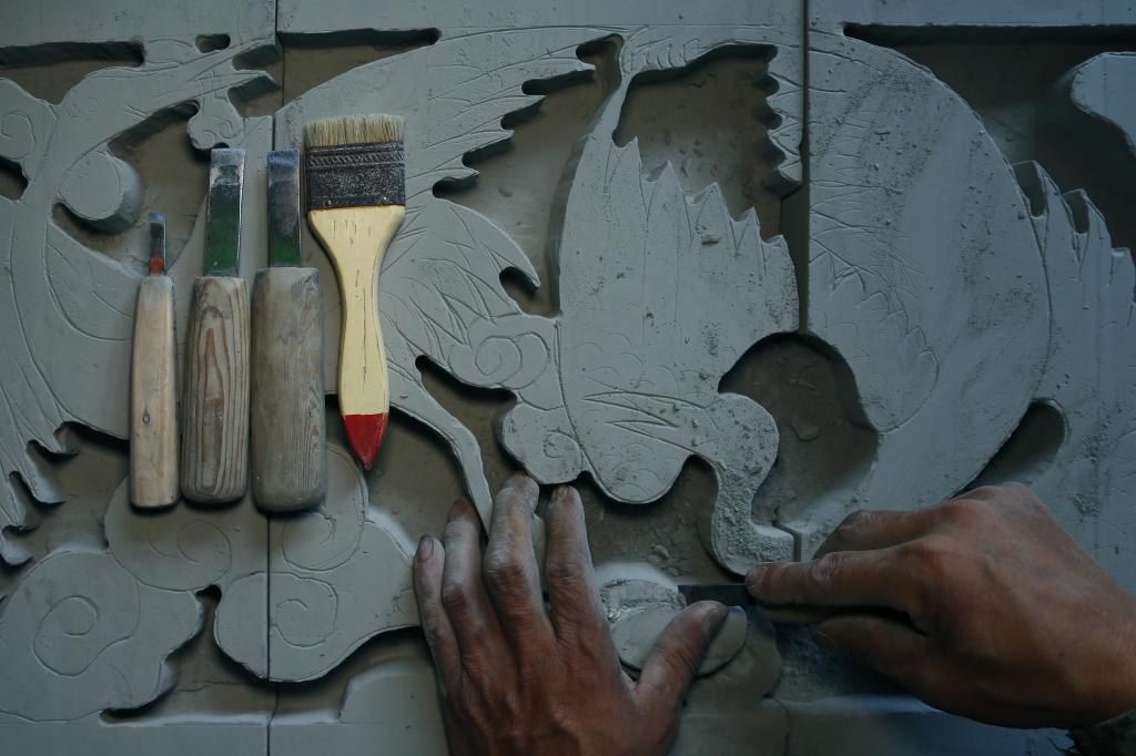 雕前先“打樣”:把設(shè)計稿拓印在涂抹過石灰水的磚面上,或者在磚塊上直接描畫?,F(xiàn)在許多外地磚雕加工廠多用電腦打樣,生產(chǎn)出來的是“制式”產(chǎn)品,千篇一律。磚雕常用的圖案王鎖貴早已爛熟于心,想要的圖案在青磚上一揮而就,當真是“鐵劃銀鉤”、揮灑自如。如此,則構(gòu)圖更加生動,細節(jié)更加充盈,最主要的是絕不雷同。接下來“打坯”:用鑿子或刻刀粗略勾勒畫面輪廓,分出基本層次。最后是“出細”:運用多種工具,或鏟、或刻、或挑,以刻畫細節(jié)。