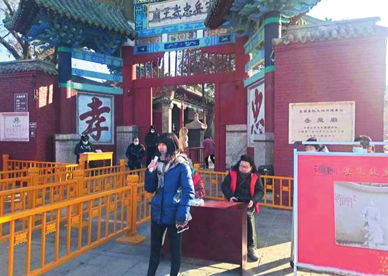 游客在景區(qū)背誦《滿江紅》