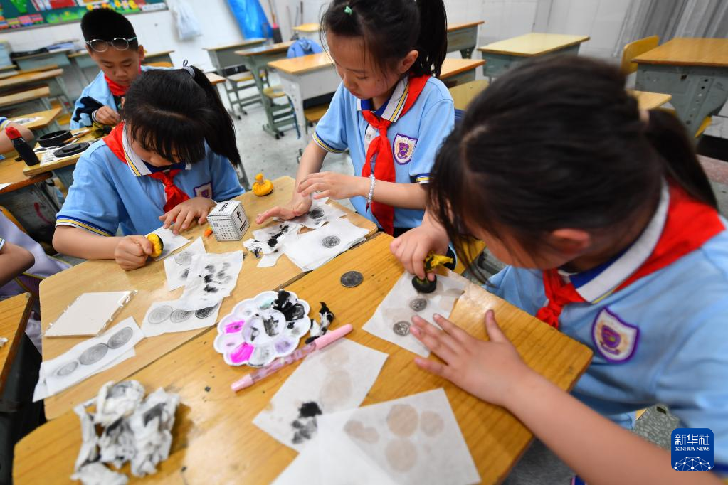 5月15日,在長沙市天心區(qū)紅衛(wèi)小學(xué),學(xué)生在拓印課上體驗(yàn)拓印制作。