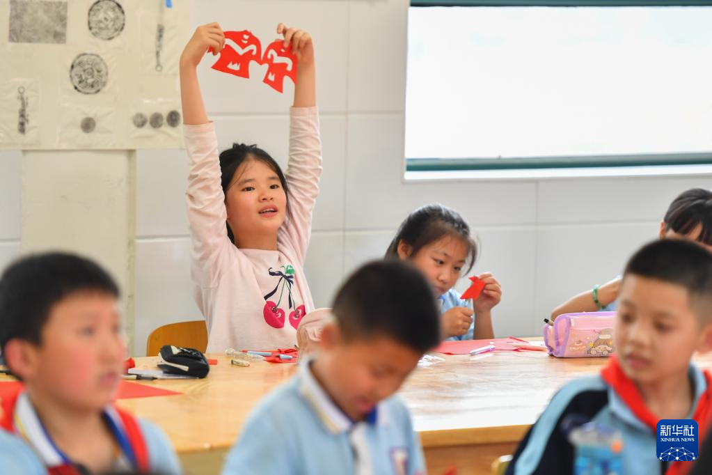 5月15日,在長沙市天心區(qū)紅衛(wèi)小學(xué),學(xué)生在剪紙藝術(shù)課上展示作品。