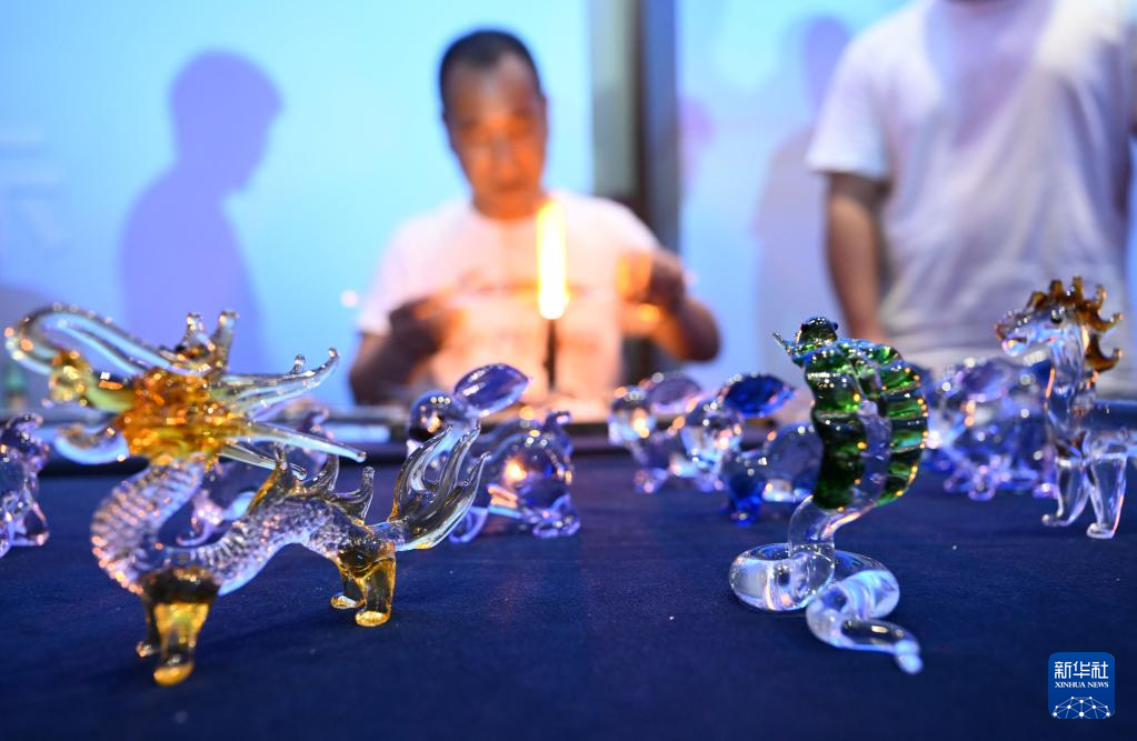 5月16日,民間藝人譚志國展示手工制作玻璃工藝品技藝。