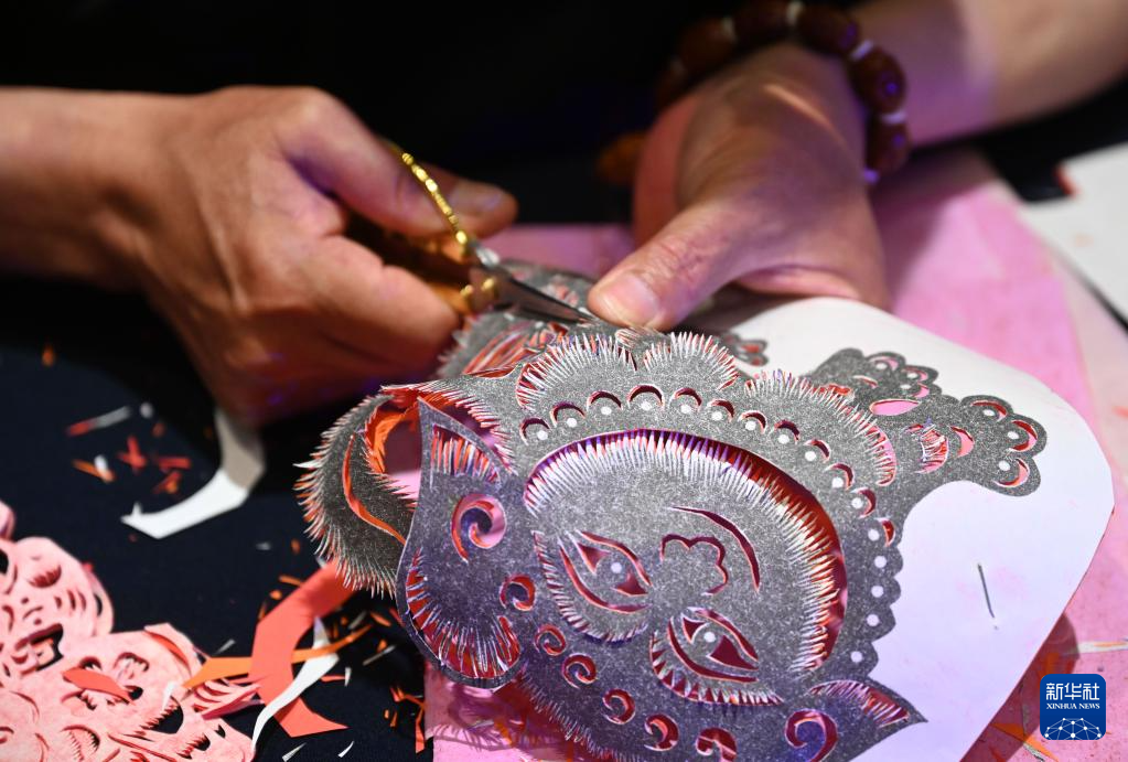 5月16日,民間藝人張林展示滿族手工剪紙技藝。