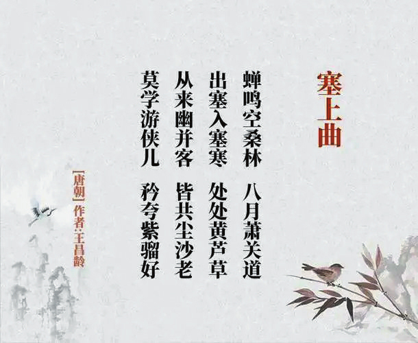 《塞上曲》唐(王昌齡):“蟬鳴空桑林,八月蕭關道。出塞入塞寒,處處黃蘆草。從來幽并客,皆共塵沙老。莫學游俠兒,矜夸紫騮好?!痹娭械娜?、塞下,說穿了就是關外和關內(nèi)。但,其實景象沒什么特別,黃云、風沙、駿馬、朔雪、美酒、桑林、關道、蘆草、沙場,也似乎只有這些才能更符合邊塞詩人的審美。而“雁門關”成了李頎、王昌齡這對好友的共同命題。
