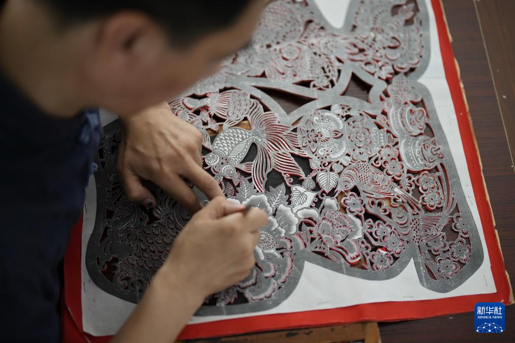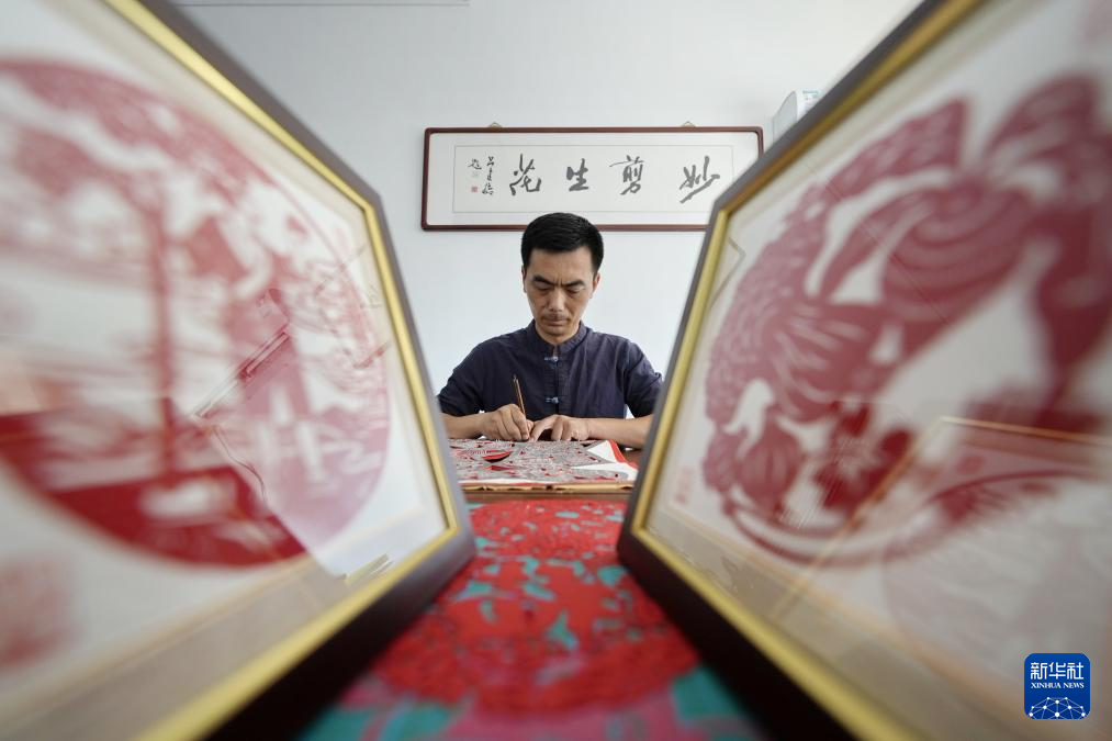 9月16日,剪紙藝人在玉田縣“非遺會客廳”工作室內創(chuàng)作剪紙作品。