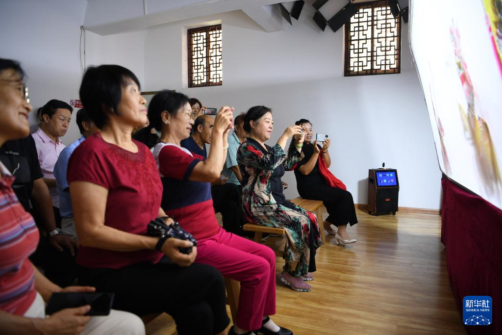 9月16日,市民在玉田縣“非遺會客廳”皮影工坊內觀看皮影戲表演。