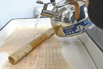 首都圖書(shū)館,工作人員在給古籍書(shū)葉清洗脫酸。