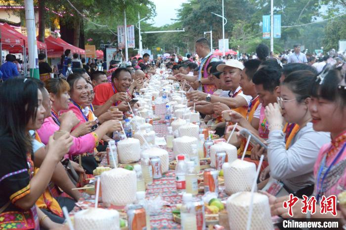 4月11日,2024年海南黎族苗族傳統(tǒng)節(jié)日“三月三”節(jié)慶活動主會場活動長桌宴在保亭黎族苗族自治縣舉行。張月和 攝