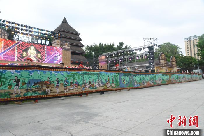 4月11日,2024年海南黎族苗族傳統(tǒng)節(jié)日“三月三”節(jié)慶活動主會場開幕式暨文藝演出在保亭黎族苗族自治縣舉行。圖為黎族民俗風情黎錦長卷展示。張月和 攝