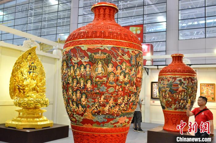 5月9日,第四屆中國工藝美術(shù)博覽會在福建福州啟幕,圖為雕漆作品《凈土文化對瓶》吸引觀展者目光。 中新網(wǎng)記者 呂明 攝