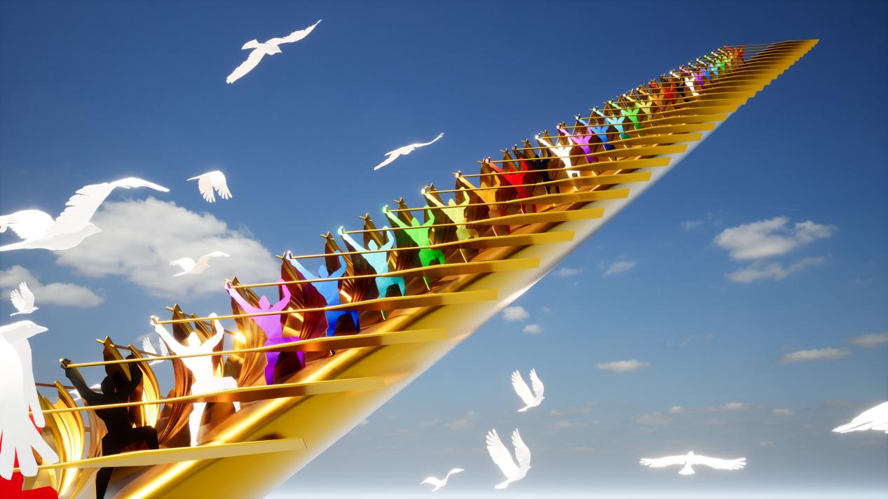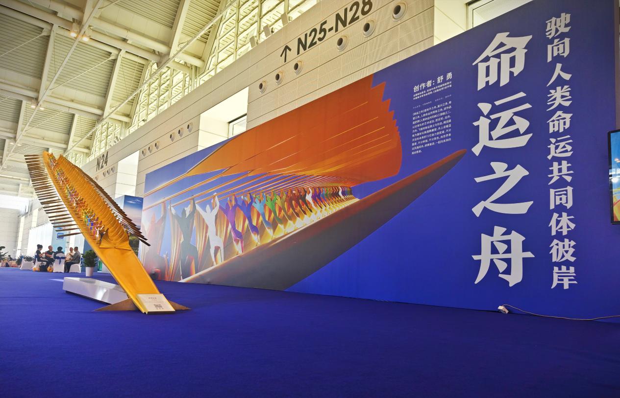 《命運(yùn)之舟》雕塑作品以巨輪、龍舟、方舟、飛船的象征意義與形態(tài),概括提煉為國際化新圖騰雕塑,舟上迎著藍(lán)天劃向未來的72位奮力劃槳者,不分國度、不分種族、不分膚色,這是世界人民風(fēng)雨同舟、命運(yùn)共同的象征。其宏偉的規(guī)模、深刻的寓意和精湛的藝術(shù)手法,成為本次文旅博覽會的一大亮點(diǎn)。