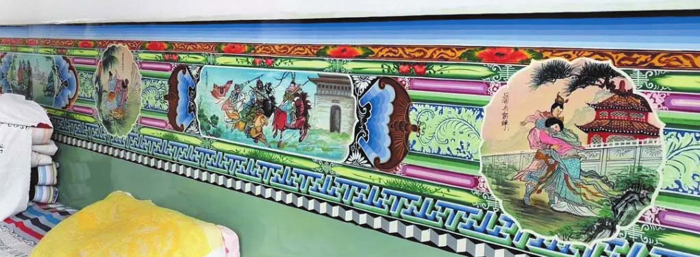 炕圍畫也叫墻圍畫,距今已有1200多年歷史,是原平人特有的“根脈性”藝術(shù)。手工藝人以墻為紙,將民族文化與當(dāng)?shù)厣?、精神巧妙融合,造型藝術(shù)集壁畫、年畫和建筑彩繪于一體,定格于墻壁之上,代代相傳?!?7歲起,我就跟隨父親學(xué)習(xí)炕圍畫技藝,如今有60多年了。”弓進(jìn)壽感慨道,“以前家家戶戶都會(huì)在炕邊畫炕圍畫。隨著時(shí)代變遷,人們住進(jìn)了樓房,我們就把炕圍畫畫在紙上?!?/p>