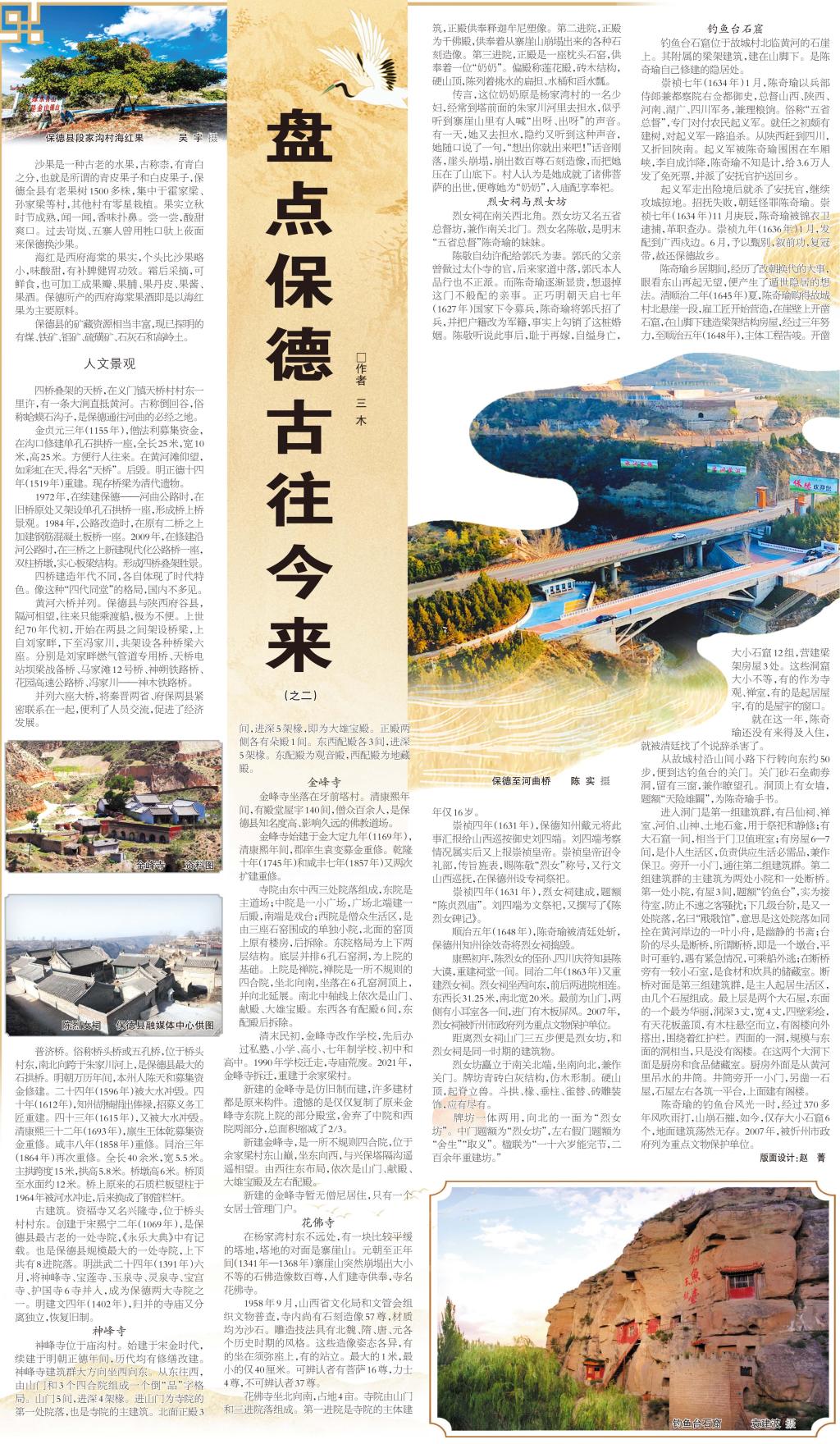 沙果是一種古老的水果,古稱柰,有青白之分,也就是所謂的青皮果子和白皮果子,保德全縣有老果樹1500多株,集中于霍家梁、孫家梁等村,其他村有零星栽植。果實立秋時節(jié)成熟,聞一聞,香味撲鼻。嘗一嘗,酸甜爽口。過去岢嵐、五寨人曾用牲口馱上莜面來保德?lián)Q沙果。 海紅是西府海棠的果實,個頭比沙果略小,味酸甜,有補脾健胃功效。霜后采摘,可鮮食,也可加工成果瓣、果脯、果丹皮、果醬、果酒。保德所產(chǎn)的西府海棠果酒即是以海紅果為主要原料。 保德縣的礦藏資源相當(dāng)豐富,現(xiàn)已探明的有煤、鐵礦、鋁礦、硫磺礦、石灰石和高嶺土。 人文景觀 四橋疊架的天橋,在義門鎮(zhèn)天橋村村東一里許,有一條大澗直抵黃河。古稱倒回谷,俗稱蛤蟆石溝子,是保德通往河曲的必經(jīng)之地。 金貞元三年(1155年),僧法利募集資金,在溝口修建單孔石拱橋一座,全長25米,寬10米,高25米。方便行人往來。在黃河灘仰望,如彩虹在天,得名“天橋”。后毀。明正德十四年(1519年)重建。現(xiàn)存橋梁為清代遺物。 1972年,在續(xù)建保德——河曲公路時,在舊橋原處又架設(shè)單孔石拱橋一座,形成橋上橋景觀。1984年,公路改造時,在原有二橋之上加建鋼筋混凝土板橋一座。2009年,在修建沿河公路時,在三橋之上新建現(xiàn)代化公路橋一座,雙柱橋墩,實心板梁結(jié)構(gòu)。形成四橋疊架勝景。 四橋建造年代不同,各自體現(xiàn)了時代特色。像這種“四代同堂”的格局,國內(nèi)不多見。 黃河六橋并列。保德縣與陜西府谷縣,隔河相望,往來只能乘渡船,極為不便。上世紀(jì)70年代初,開始在兩縣之間架設(shè)橋梁,上自劉家畔,下至馮家川,共架設(shè)各種橋梁六座。分別是劉家畔燃氣管道專用橋、天橋電站壩梁戰(zhàn)備橋、馬家灘12號橋、神朔鐵路橋、花園高速公路橋、馮家川——神木鐵路橋。 并列六座大橋,將秦晉兩省、府保兩縣緊密聯(lián)系在一起,便利了人員交流,促進了經(jīng)濟發(fā)展。 普濟橋。俗稱橋頭橋或五孔橋,位于橋頭村東,南北向跨于朱家川河上,是保德縣最大的石拱橋。明朝萬歷年間,本州人陳天和募集資金修建。二十四年(1596年)被大水沖毀。四十年(1612年),知州胡楠捐出俸祿,招募義務(wù)工匠重建。四十三年(1615年),又被大水沖毀。清康熙三十二年(1693年),廩生王體乾募集資金重修。咸豐八年(1858年)重修。同治三年(1864年)再次重修。全長40余米,寬5.5米。主拱跨度15米,拱高5.8米。橋墩高6米。橋頂至水面約12米。橋上原來的石質(zhì)欄板望柱于1964年被河水沖走,后來換成了鋼管欄桿。 古建筑。資福寺又名興隆寺,位于橋頭村村東。創(chuàng)建于宋熙寧二年(1069年),是保德縣最古老的一處寺院,《永樂大典》中有記載。也是保德縣規(guī)模最大的一處寺院,上下共有8進院落。明洪武二十四年(1391年)六月,將神峰寺、寶蓮寺、玉泉寺、靈泉寺、寶宮寺、護國寺6寺并入,成為保德兩大寺院之一。明建文四年(1402年),歸并的寺廟又分離獨立,恢復(fù)舊制。 神峰寺 神峰寺位于廟溝村。始建于宋金時代,續(xù)建于明朝正德年間,歷代均有修繕改建。神峰寺建筑群大方向坐西向東。從東往西,由山門和3個四合院組成一個倒“品”字格局。山門5間,進深4架椽。進山門為寺院的第一處院落,也是寺院的主建筑。北面正殿3間,進深5架椽,即為大雄寶殿。正殿兩側(cè)各有朵殿1間。東西配殿各3間,進深5架椽。東配殿為觀音殿,西配殿為地藏殿。 金峰寺 金峰寺坐落在牙前塔村。清康熙年間,有殿堂屋宇140間,僧眾百余人,是保德縣知名度高、影響久遠的佛教道場。 金峰寺始建于金大定九年(1169年),清康熙年間,郡庠生袁變募金重修。乾隆十年(1745年)和咸豐七年(1857年)又兩次擴建重修。 寺院由東中西三處院落組成,東院是主道場;中院是一小廣場,廣場北端建一后殿,南端是戲臺;西院是僧眾生活區(qū),是由三座石窯圍成的單獨小院,北面的窯頂上原有樓房,后拆除。東院格局為上下兩層結(jié)構(gòu)。底層并排6孔石窯洞,為上院的基礎(chǔ)。上院是禪院,禪院是一所不規(guī)則的四合院,坐北向南,坐落在6孔窯洞頂上,并向北延展。南北中軸線上依次是山門、獻殿、大雄寶殿。東西各有配殿6間,東配殿后拆除。 清末民初,金峰寺改作學(xué)校,先后辦過私塾、小學(xué)、高小、七年制學(xué)校、初中和高中。1990年學(xué)校遷走,寺廟荒廢。2021年,金峰寺拆遷,重建于余家梁村。 新建的金峰寺是仿舊制而建,許多建材都是原來構(gòu)件。遺憾的是僅僅復(fù)制了原來金峰寺東院上院的部分殿堂,舍棄了中院和西院兩部分,總面積縮減了2/3。 新建金峰寺,是一所不規(guī)則四合院,位于余家梁村東山巔,坐東向西,與興保塔隔溝遙遙相望。由西往東布局,依次是山門、獻殿、大雄寶殿及左右配殿。 新建的金峰寺暫無僧尼居住,只有一個女居士管理門戶。 花佛寺 在楊家灣村東不遠處,有一塊比較平緩的塔地,塔地的對面是寨崖山。元朝至正年間(1341年—1368年)寨崖山突然崩塌出大小不等的石佛造像數(shù)百尊,人們建寺供奉,寺名花佛寺。 1958年9月,山西省文化局和文管會組織文物普查,寺內(nèi)尚有石刻造像57尊,材質(zhì)均為沙石。雕造技法具有北魏、隋、唐、元各個歷史時期的風(fēng)格。這些造像姿態(tài)各異,有的坐在須彌座上,有的站立。最大的1米,最小的