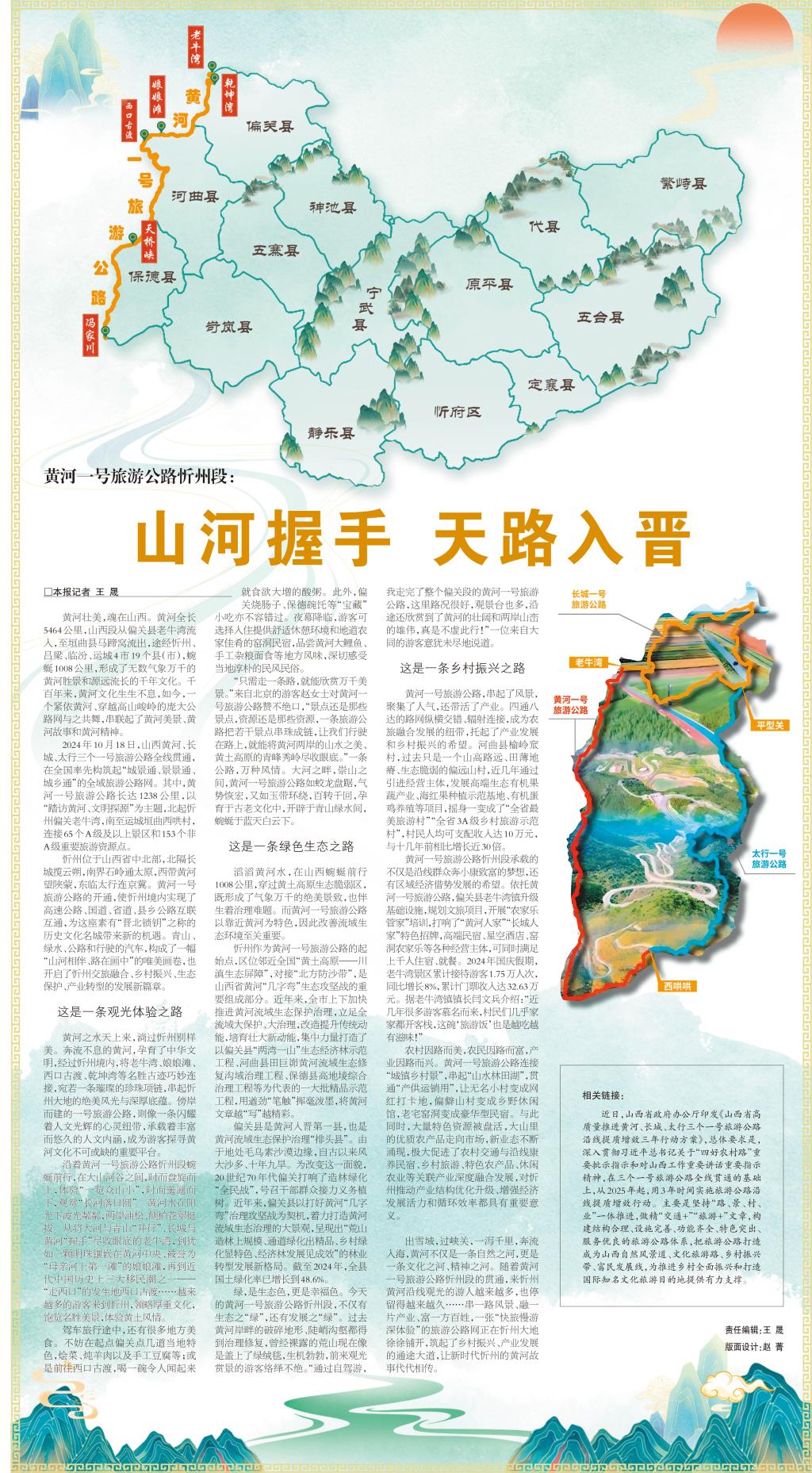 2024年10月18日,山西黃河、長城、太行三個一號旅游公路全線貫通,在全國率先構(gòu)筑起“城景通、景景通、城鄉(xiāng)通”的全域旅游公路網(wǎng)。其中,黃河一號旅游公路長達(dá)1238公里,以“踏訪黃河、文明探源”為主題,北起忻州偏關(guān)老牛灣,南至運城垣曲西哄村,連接65個A級及以上景區(qū)和153個非A級重要旅游資源點。